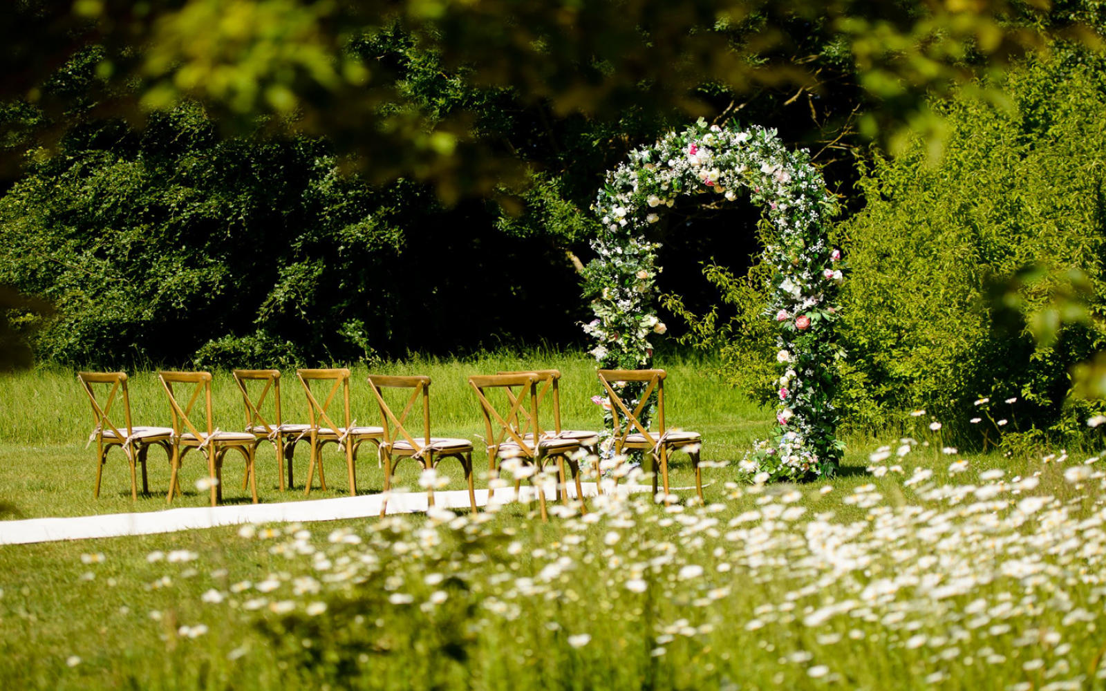 With the surroundings of daisies and trees, the theme required rustic chairs and classical English summer flowers. We were able to borrow chairs from Hospitality Services based in Swindon, and Sandra provided a beautiful arch of silk roses which she linked with a cream carpet to two columns giving a grand entrance for the bride.