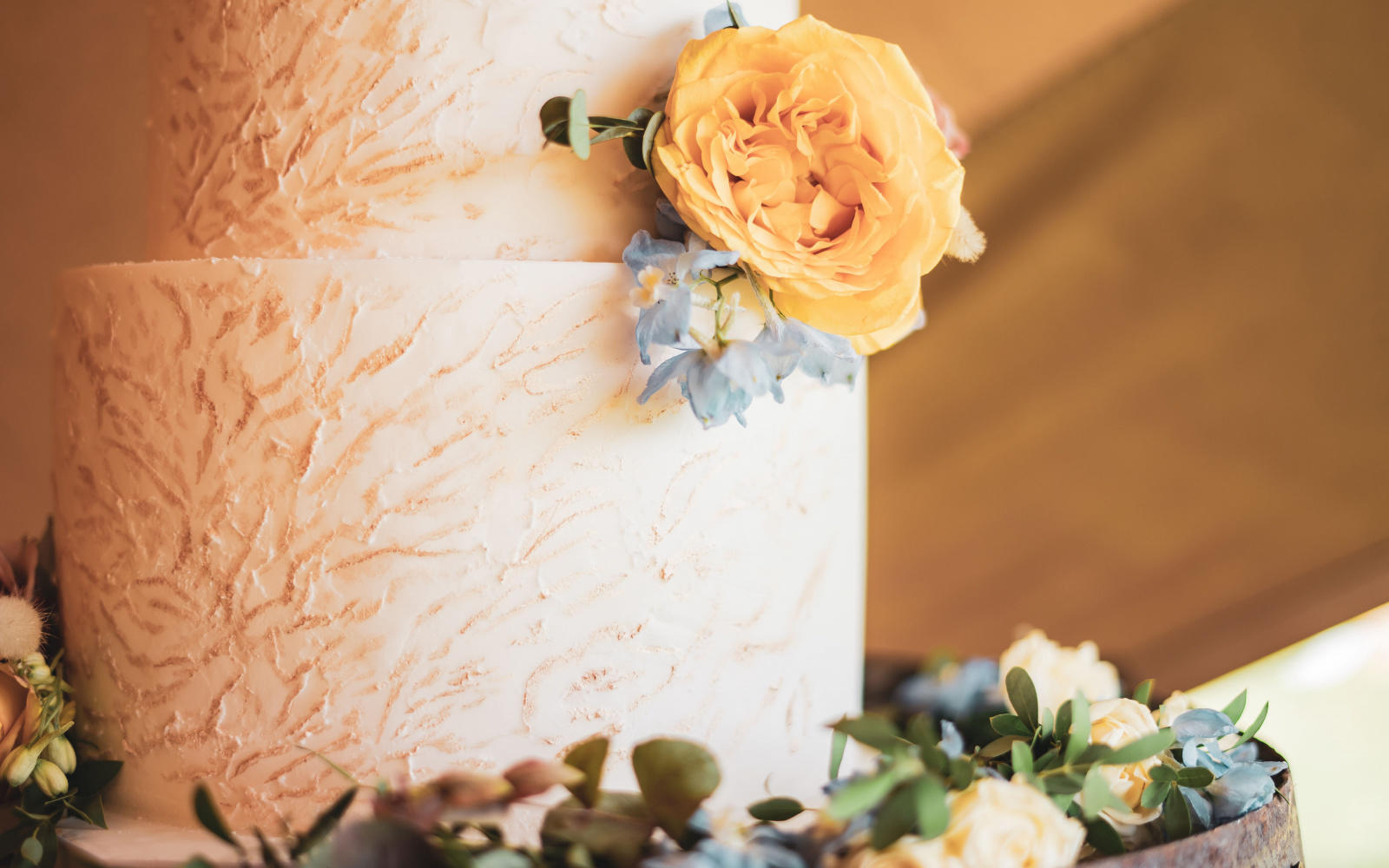 The flowers were kept in a natural free-flowing style using lots of seasonal British Grown Blooms and beautiful pampas grass to add texture. No floral foams were used which allowed for a natural looking tear drop bouquet style and a free-flowing arbour which blended beautifully into the surroundings. Complementing flowers were fed through to the cake to tie the whole look together.